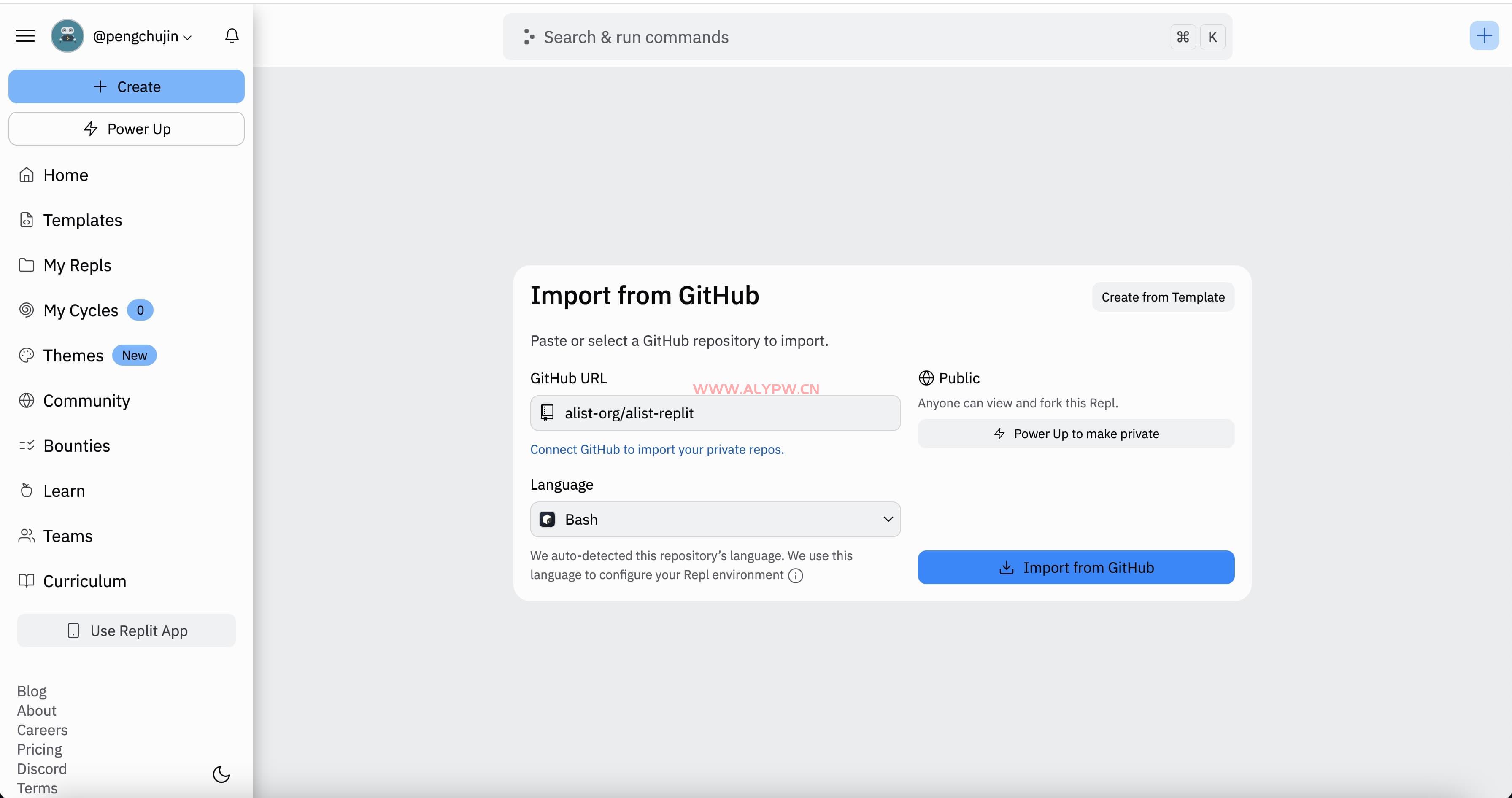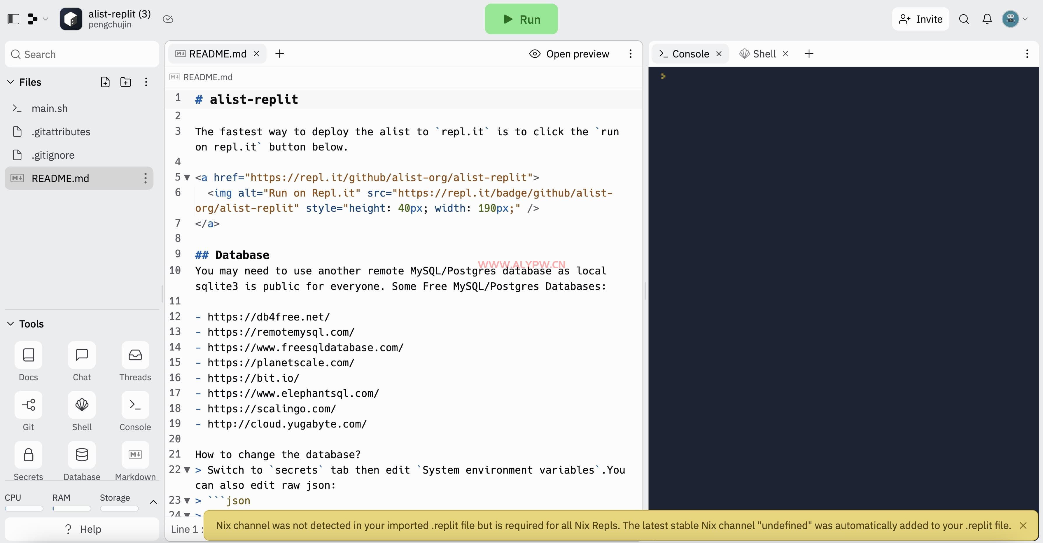 replit 是一个在线开发平台,当然也可以白嫖运行 alist 的服务。alist 官方也有给提供一键导入运行的链接。