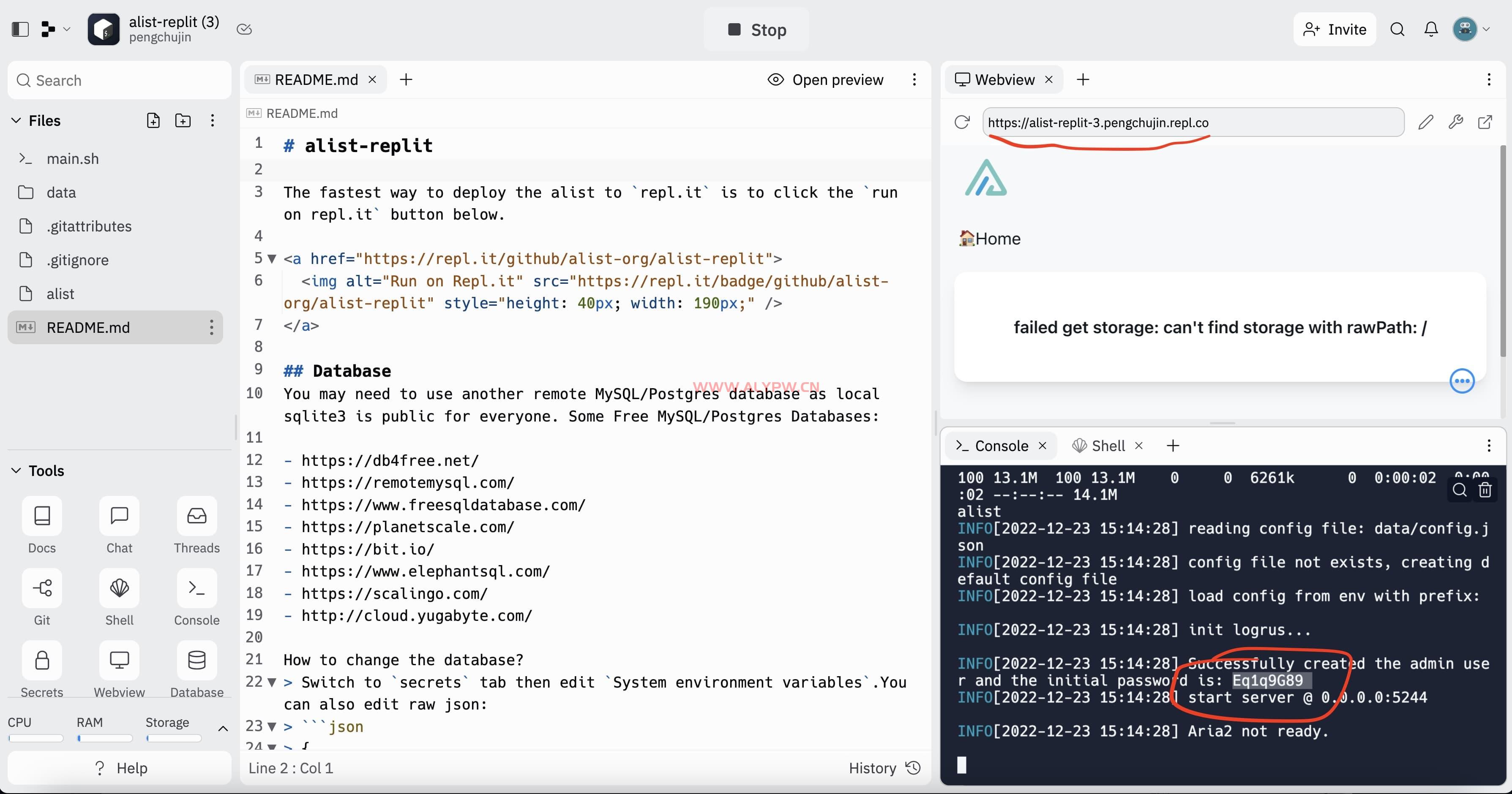 完成后就能看到 replit 提供的链接就是我们的后台地址,右下角输出的就是我们后台的密码,也就能打开登录使用了。