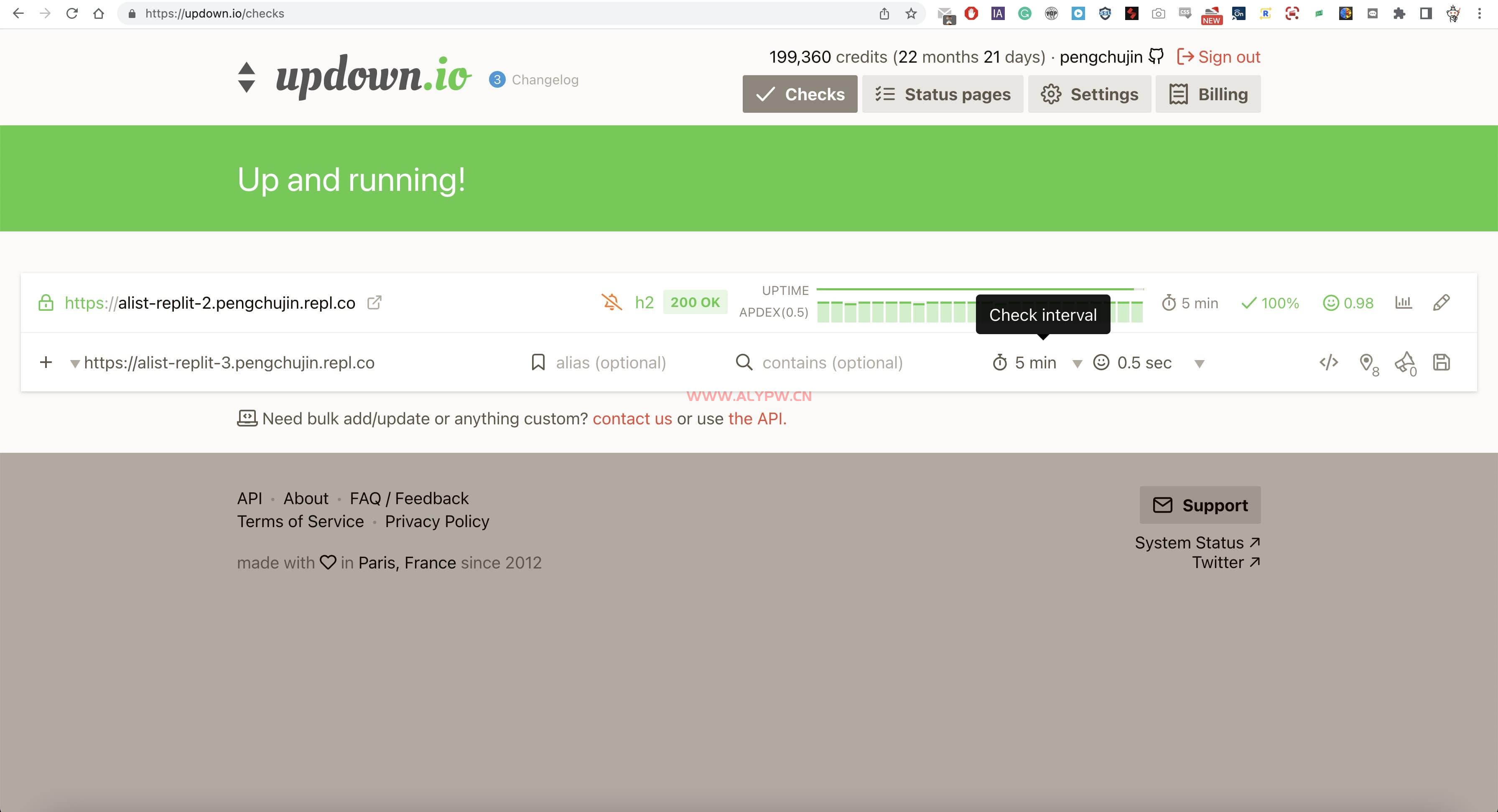 replit 一段时间不访问就会自动杀死,推荐在监控网站上添加个 5 分钟每次的监控,以我在用的 updown.io 为例。注册登录以后,输入刚才 alist 链接地址,然后勾选5分钟,再点击保存就好了