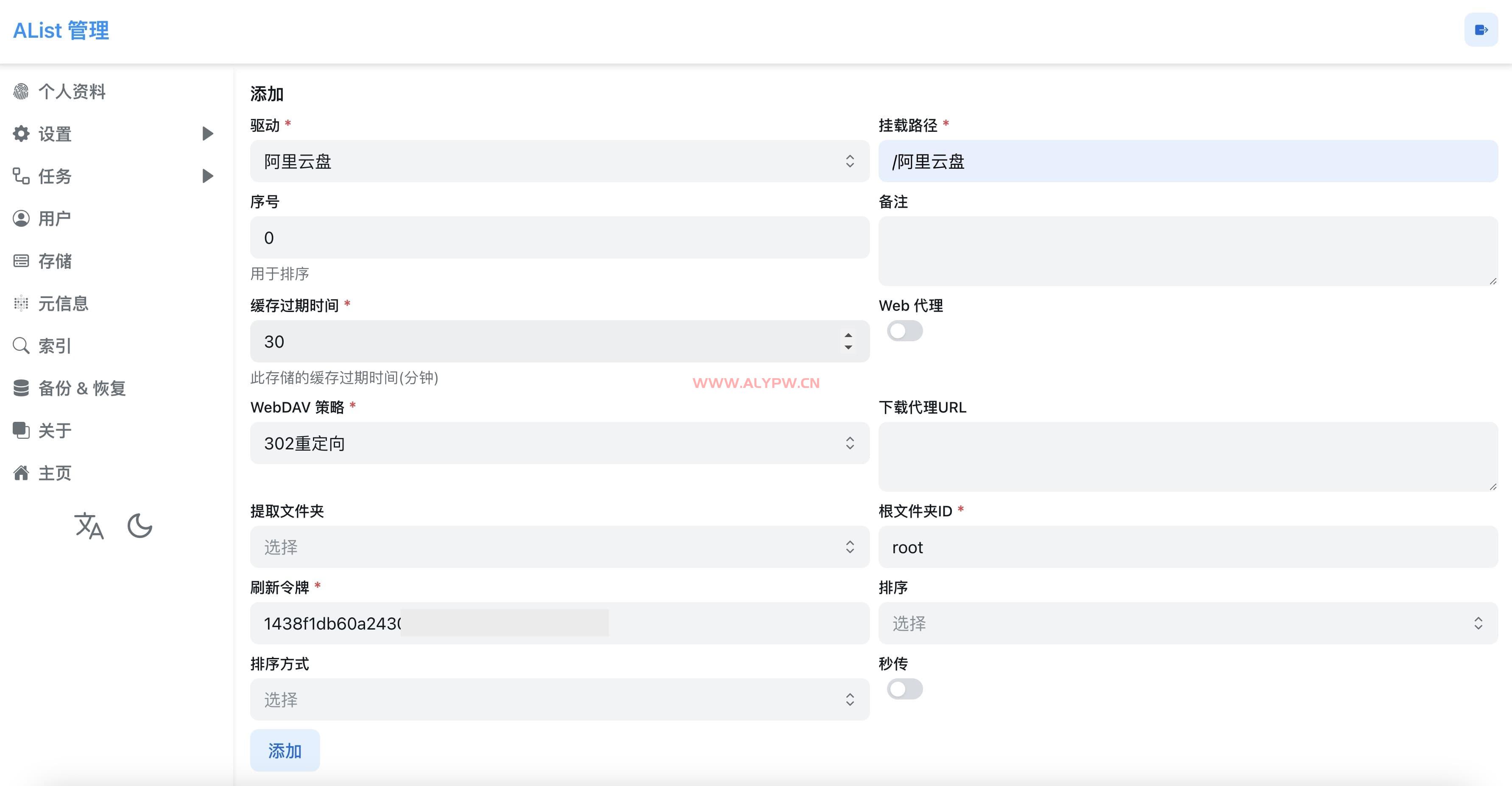 刷新令牌:在 alist 官方文档 用手机阿里云盘 app 扫码就能得到 (不要泄漏,保存好)
