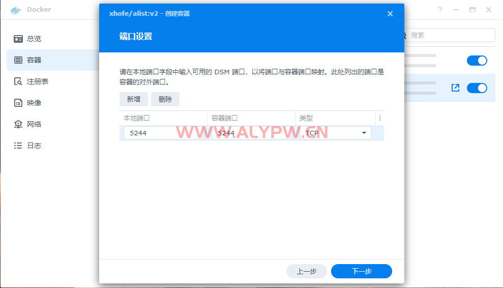 然后转到容器页面,用刚刚下载的映像创建容器,网络选项默然直接下一步。