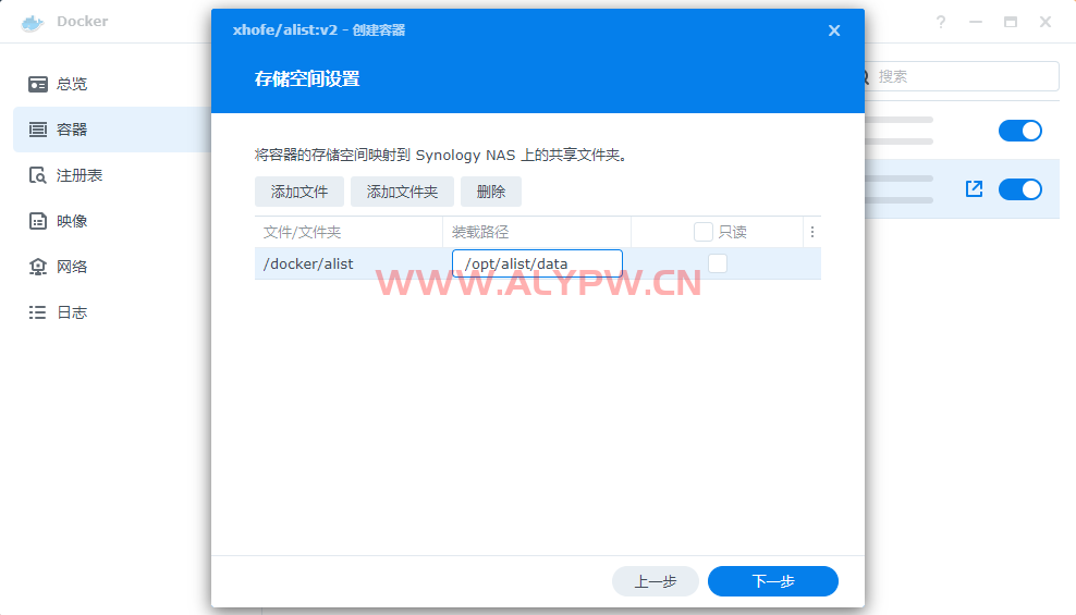 下一步以后开始文件夹映射,需要选择一个存放alist配置文件的文件夹,选择完以后右边填写映射地址/opt/alist/data ,点击下一步。