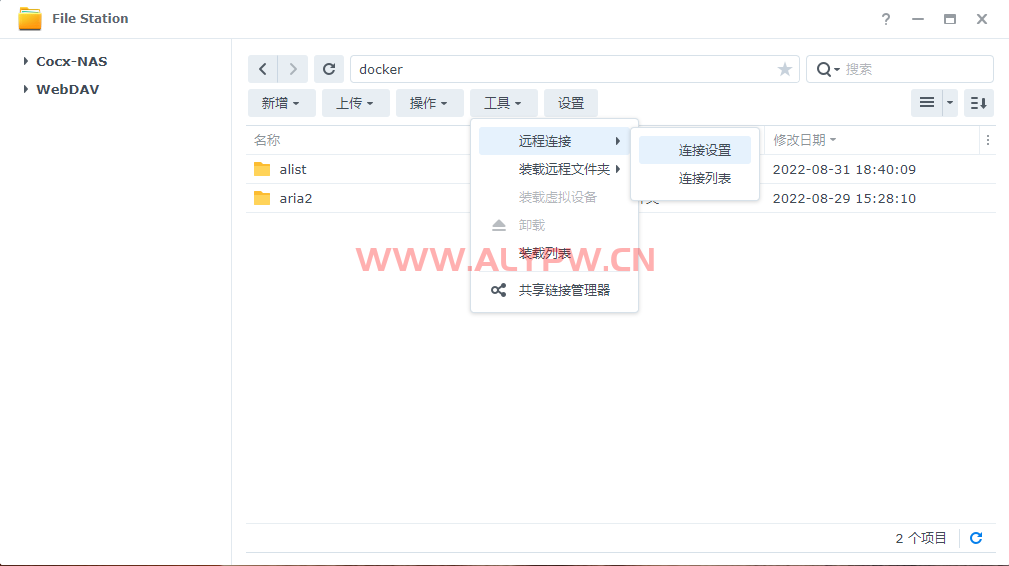 需要在群辉中挂载Alist,在文件管理器中选择工具-远程连接-连接设置。
